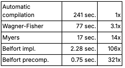 The final software gain came from an unexpected observation: at this point, most of the remaining compute resource was spent comparing character pairs, not computing the edit distance itself. Since the sanctions list is not encrypted, those comparisons can be precomputed once and reused. That single insight delivers another 3x improvement, reaching 0.75 seconds and 321x over the original baseline.